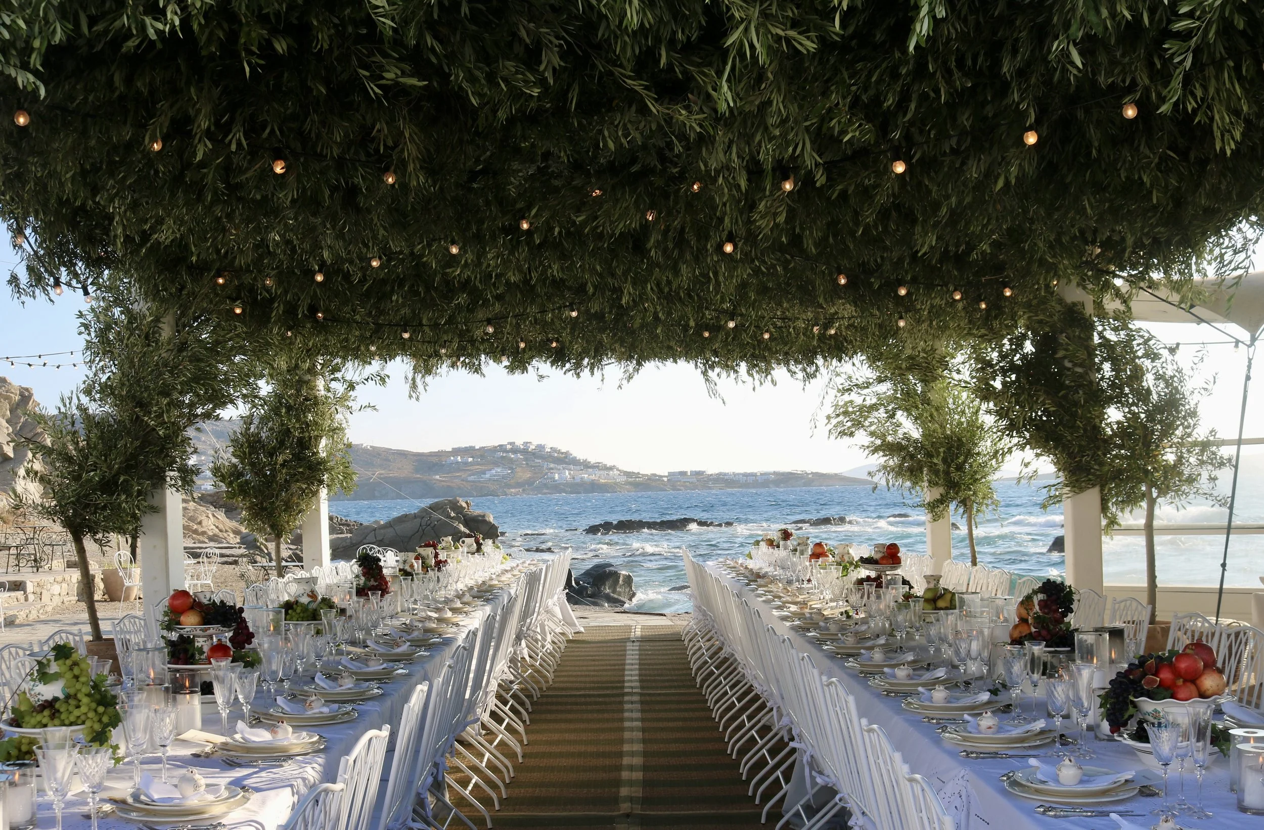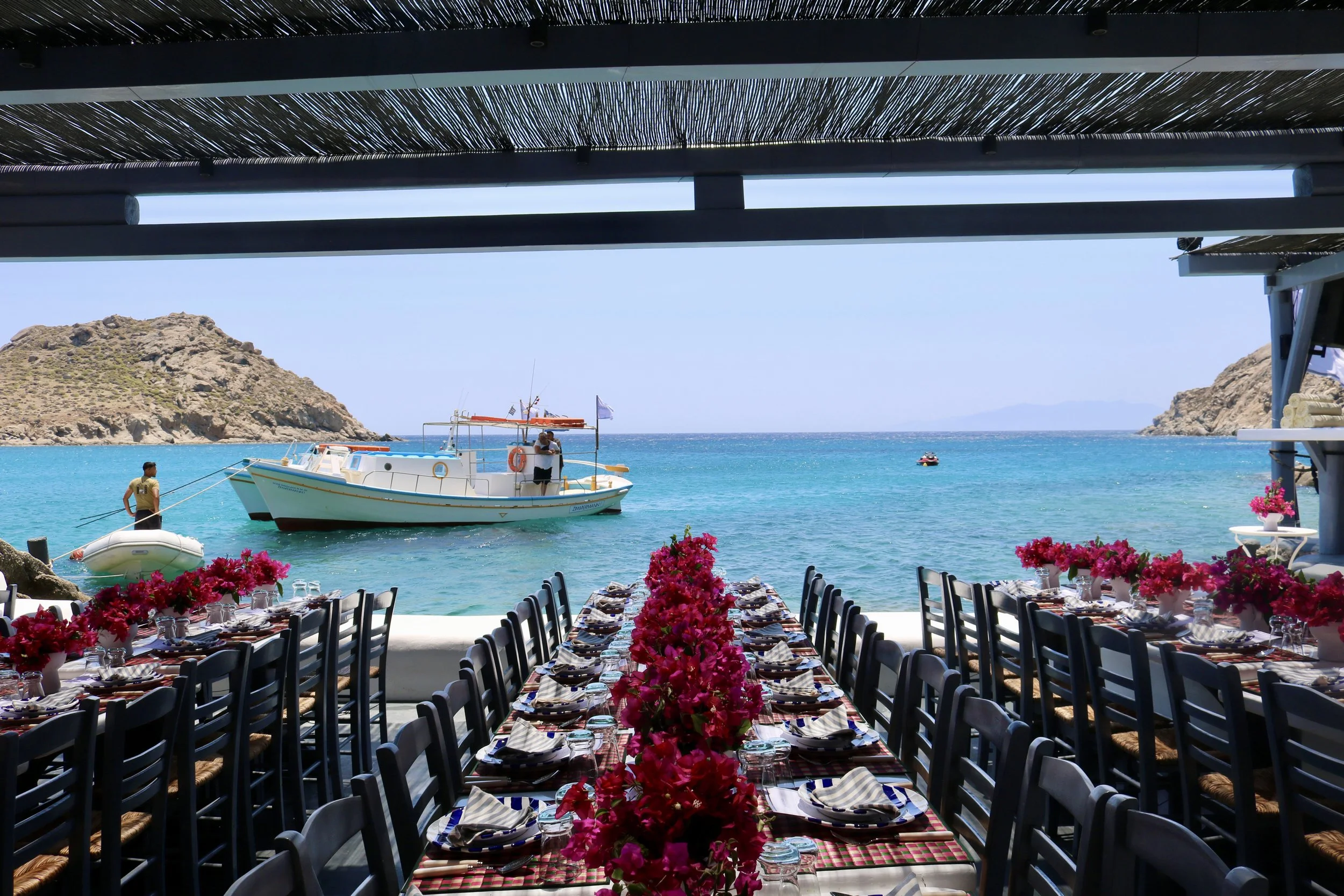 The following afternoon, the mood turned breezy and playful at Spilia. Guests arrived by custom boats for a seaside experience of lunch, swimming, and dancing against a backdrop of crystalline waters and sun-washed stone.
